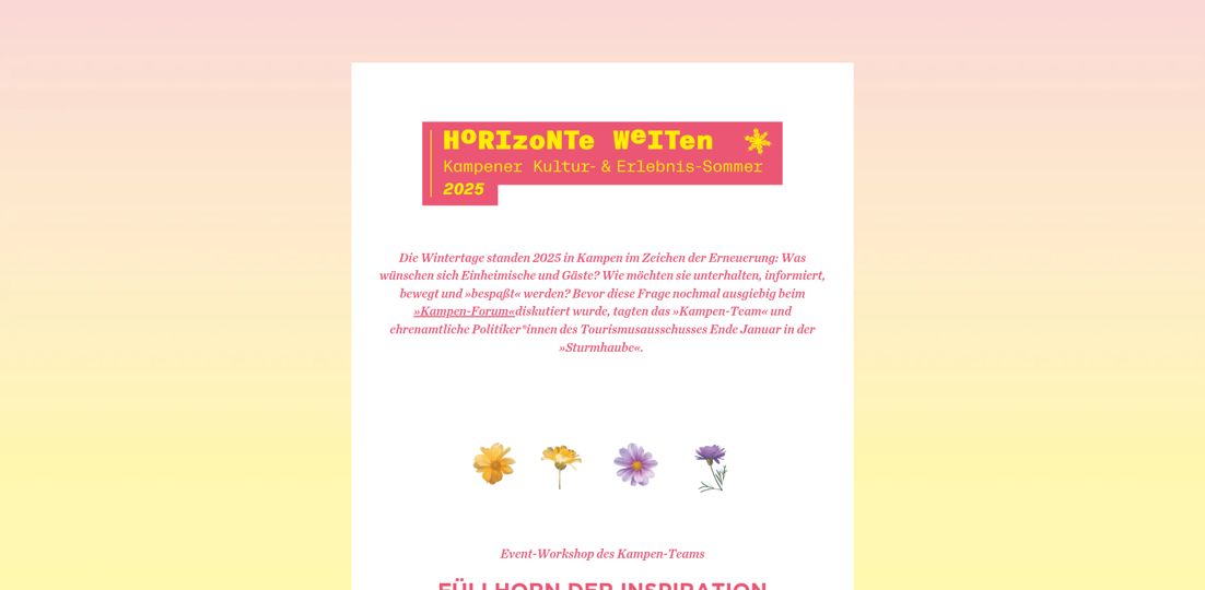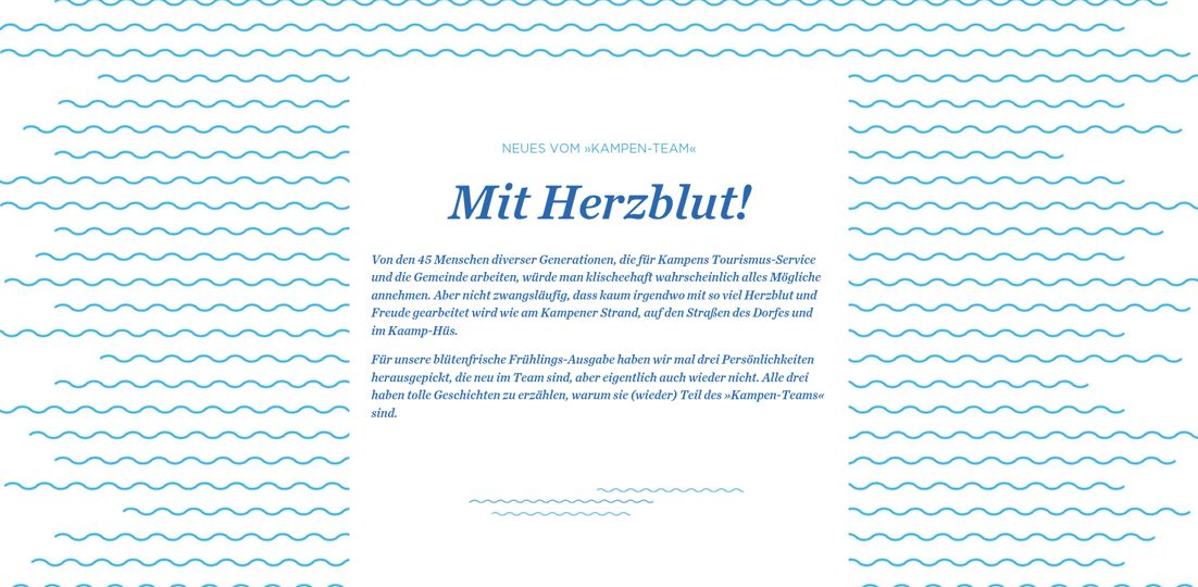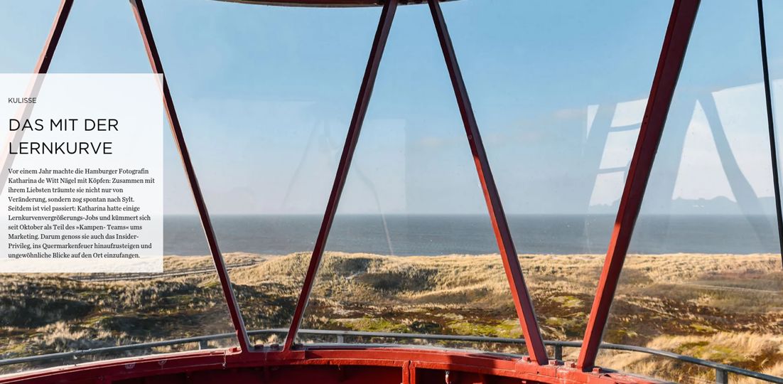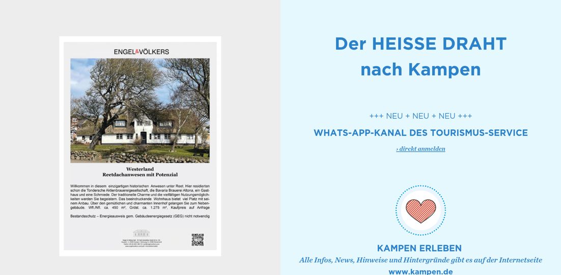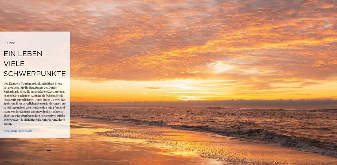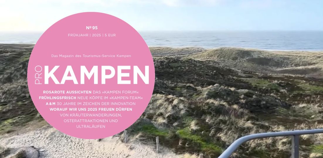 Herausgeber: Tourismus-Service Kampen · Birgit Friese · Hauptstr. 12, 25999 Kampen auf Sylt · Telefon: 04651 / 46 98-0 · Fax: 04651 / 46 98-40 Redaktion: fofftein Text · Imke Wein · Osterwiese 12 c, 25996 Wenningstedt · E-Mail: imke@fofftein.net Mitarbeiter dieser Ausgabe: Frank Deppe Art-Direction/Layout print und digital: in medias red. Hamburg · Maren Meyer-Ernsting und Nina Broyer · E-Mail: post@inmediasred.de · Telefon: 040 / 33425010 Anzeigen: Tobias Enkelmann · E-Mail: prokampen@kampen.de Titelbild: Katharina de Witt Copyright: Tourismus-Service Kampen