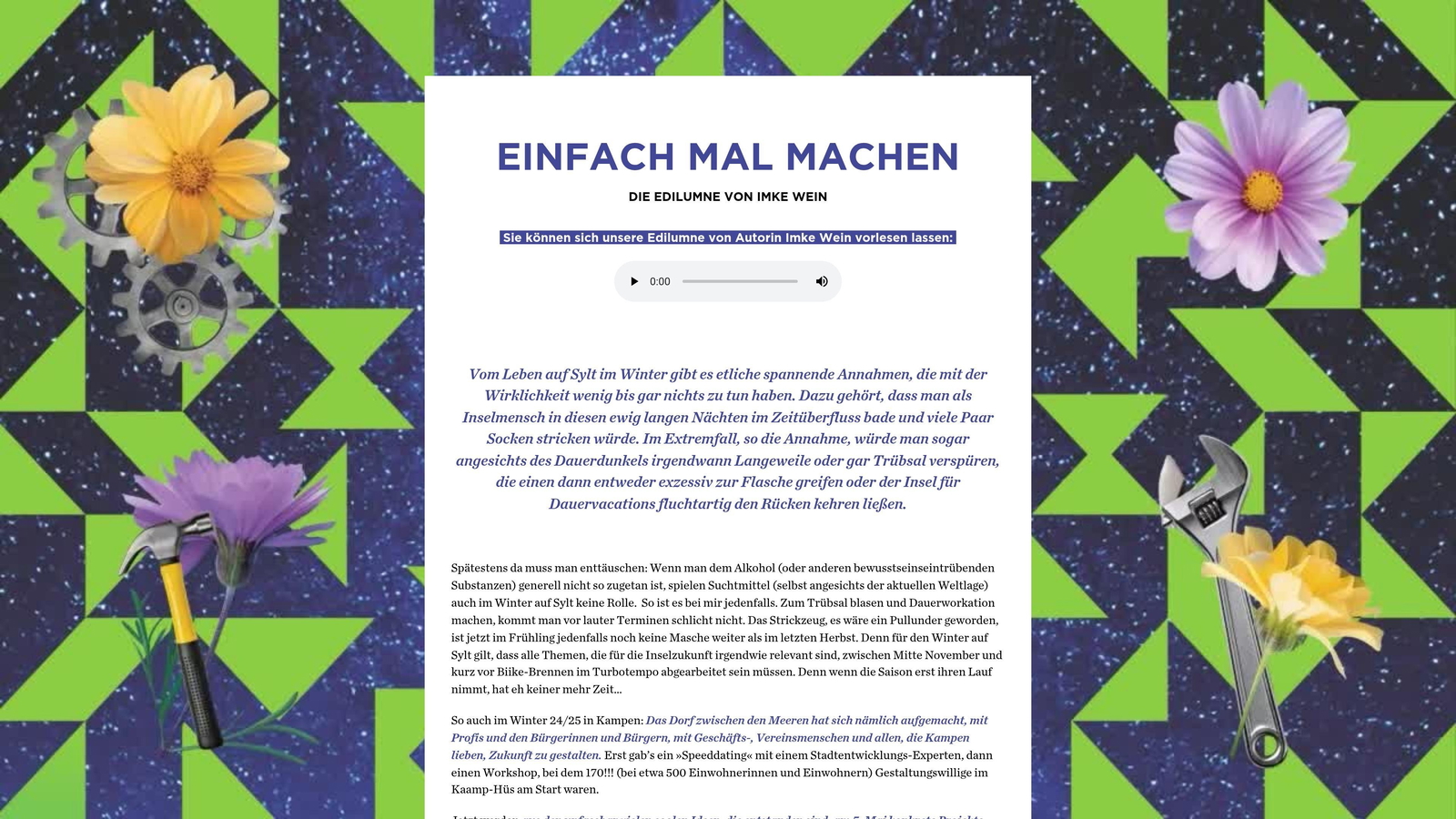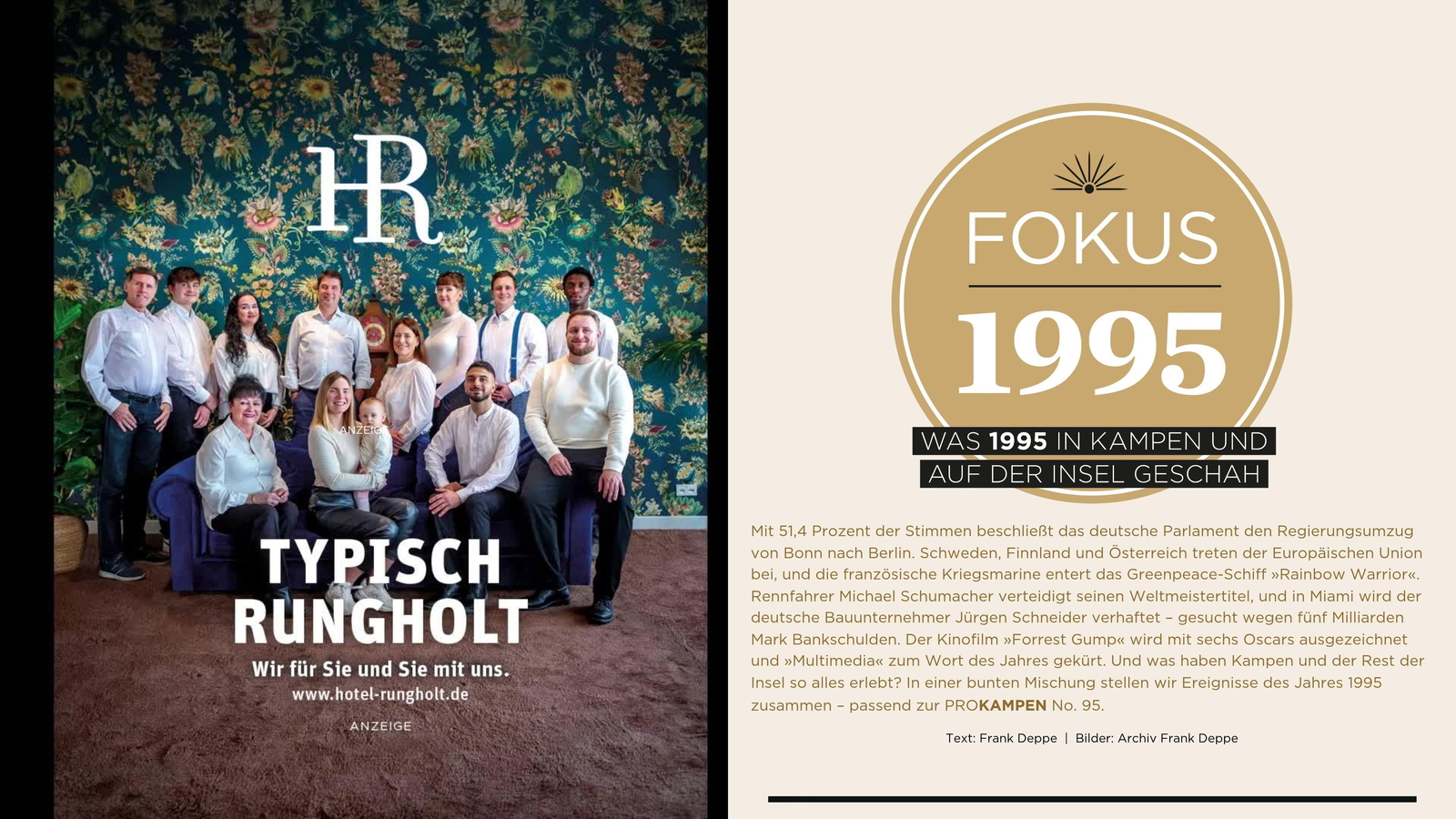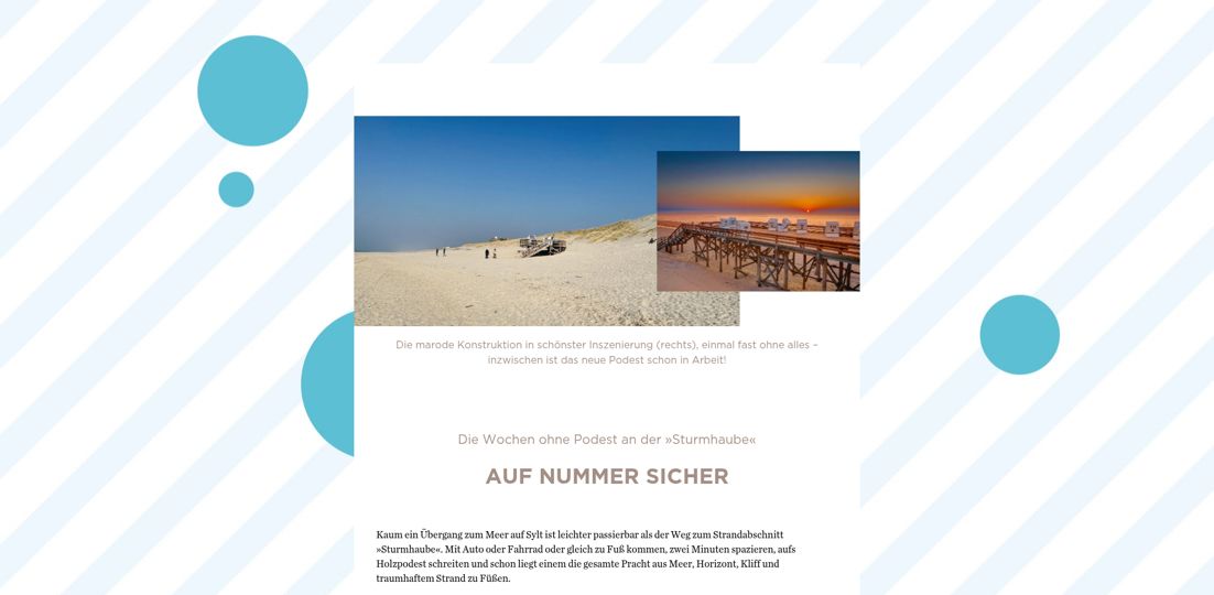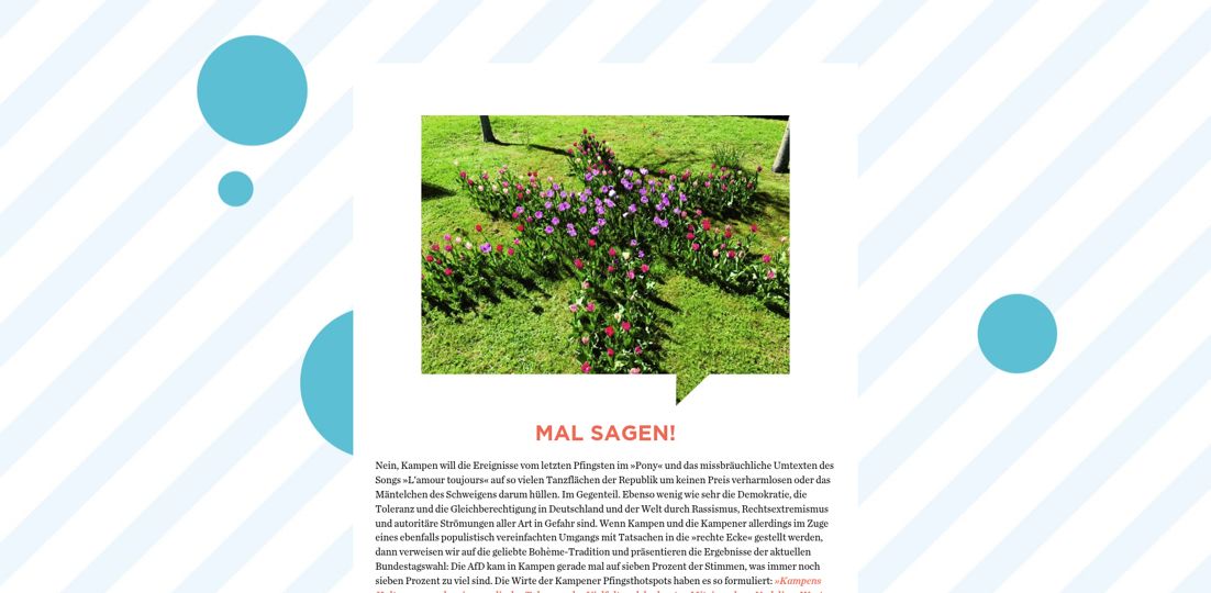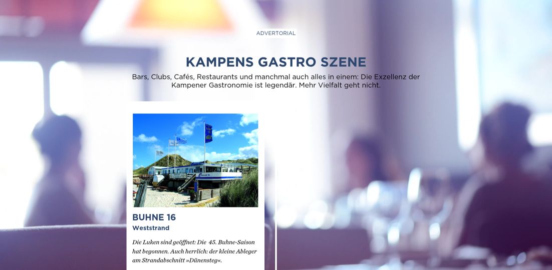 Herausgeber: Tourismus-Service Kampen · Birgit Friese · Hauptstr. 12, 25999 Kampen auf Sylt · Telefon: 04651 / 46 98-0 · Fax: 04651 / 46 98-40 Redaktion: fofftein Text · Imke Wein · Osterwiese 12 c, 25996 Wenningstedt · E-Mail: imke@fofftein.net Mitarbeiter dieser Ausgabe: Frank Deppe Art-Direction/Layout print und digital: in medias red. Hamburg · Maren Meyer-Ernsting und Nina Broyer · E-Mail: post@inmediasred.de · Telefon: 040 / 33425010 Anzeigen: Tobias Enkelmann · E-Mail: prokampen@kampen.de Titelbild: Katharina de Witt Copyright: Tourismus-Service Kampen