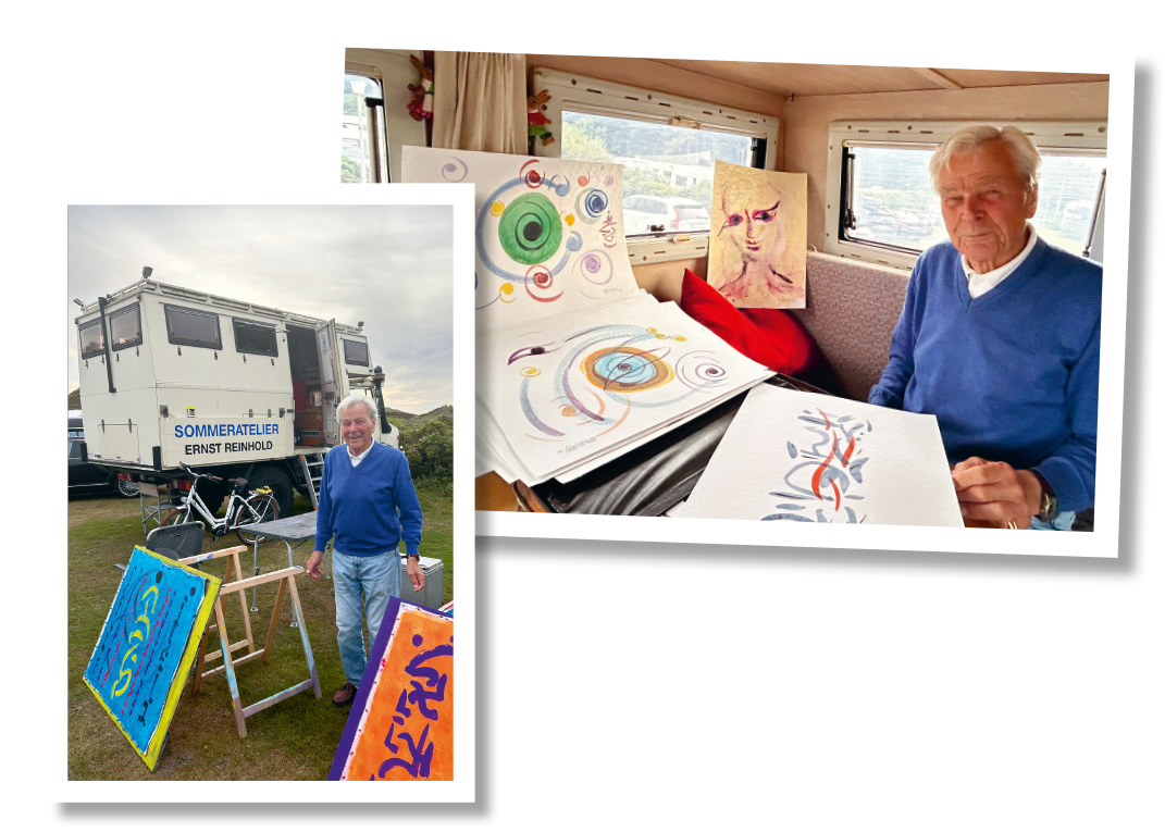 beschreibt der Feingeist den Insel-Effekt. Ein Rhythmus, dem er sich nicht widersetzt, sondern hingibt. Seit er 1950 das erste Mal aus München nach Kampen kam, ist er hingerissen von der Energie und Kraft dieses Ortes. »Es macht gar keinen Sinn, nur ein paar Tage nach Sylt zu kommen. Drei Wochen sollten es schon sein«, versichert er in seinem sandfarbenen, selbst ausgebauten »Unimog«, der schon die Wüsten dieser Welt durchquert hat und im Sommer auf Sylt seine Herberge, seine Burg, sein Sommeratelier ist. Von hier aus überschaut er mit weitem Blick die Campingidylle Richtung Wäldchen und Dünen. Apropos Weite: Der gesamte Lebensentwurf von Ernst Reinhold ist das Gegenteil von eng. Ein Gespräch mit ihm fördert profunde Erkenntnisse zutage, vorgetragen in einer beinahe literarischen Sprache, die wahrscheinlich sogar Thomas Mann beeindruckt hätte.