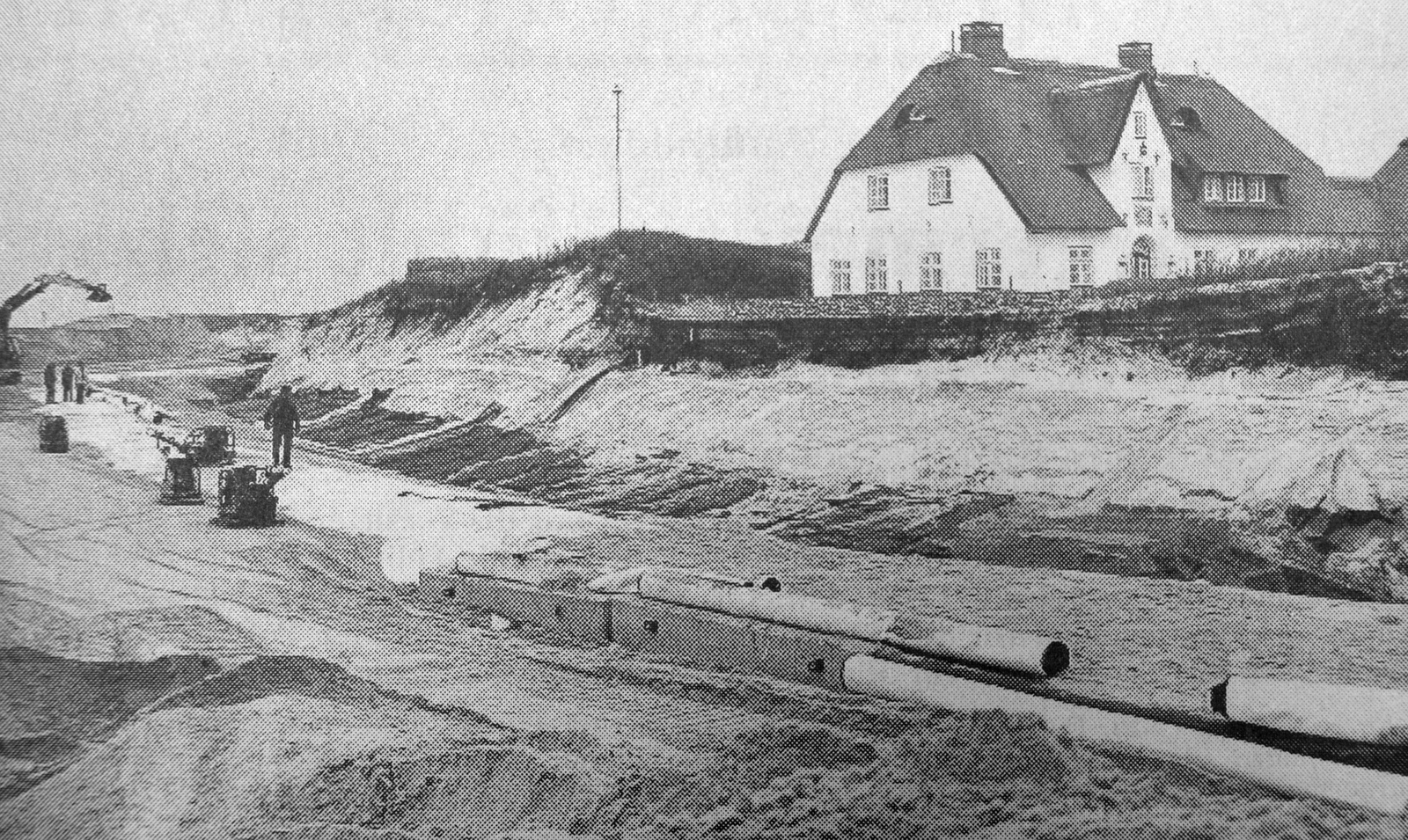 Nach zwei schweren Sturmfluten im Januar und Februar lag das Kampener Haus »Kliffende« nur noch gute fünf Meter von der Abbruchkante entfernt. Höchste Zeit zum Handeln: Die »Deutsche Bank« als damaliger Eigentümer ließ am Kliff auf 60 Metern Länge Geotextilien eingraben. Die Kosten für das Pilotprojekt – 416 mit jeweils zehn Kubikmetern Sand gefüllte Polyester-Säcke wurden verlegt – betrugen 1,2 Millionen Mark.